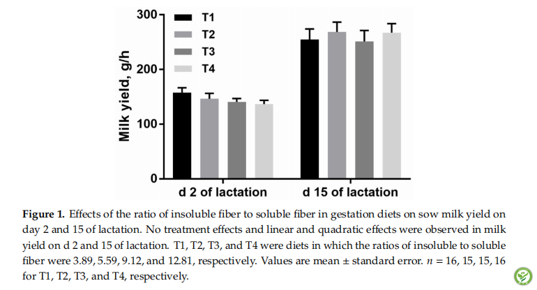 图1:哺乳期第2天和第15天,妊娠日粮中不溶性纤维与可溶性纤维的比例对母乳产量的影响。在泌乳第2天和第15天,未观察到产奶量的处理效果以及线性和二次方影响。T1,T2,T3和T4是日粮,其中不溶性纤维与可溶性纤维的比率分别为3.89、5.59、9.12和12.81。数值是平均值±标准误。T1,T2,T3和T4的n分别为16、15、15、16。