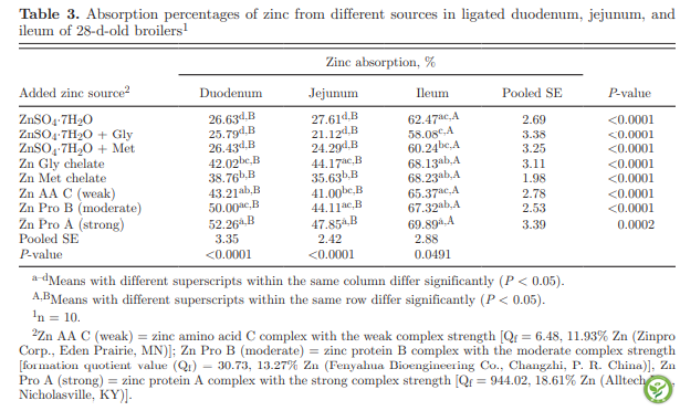 结果表明:在3个肠段中ZnSO4+Gly、ZnSO4+Met和ZnSO4的吸收率,没有差异(P>0.05)。Zn-Gly螯合物、Zn-Met螯合物、Zn AA C、Zn Pro B和Zn Pro A在十二指肠和空肠中的吸收率比ZnSO4、ZnSO4+Gly和ZnSO4+Met高29%-129%(P<0.05),顺序为Zn Pro A>Zn Pro B>Zn AAC>Zn-Gly螯合物或Zn-Met螯合物>ZnSO4、ZnSO4+Met或ZnSO4+Gly。回肠不同锌源对锌的吸收变化也与十二指肠和空肠相似。植酸水平与锌源对3个肠段锌吸收的影响存在显著的交互作用(P<0.05)。添加植酸组(10:1)的十二指肠对 ZnSO4的吸收率比未添加植酸组的十二指肠对 ZnSO4的吸收率低40%(P<0.05)。随着植酸水平的增加,3个肠段对有机锌源Zn的吸收变化与十二指肠对ZnSO4的吸收变化相似。然而,随着螯合强度的增加,有机锌的吸收也增加,其中Zn Pro A的锌吸收最高。这些结果表明,有机锌的吸收比锌作为无机锌的吸收更有效。随着螯合强度的增加,有机锌的吸收也增加。硫酸锌与氨基酸的简单混合物不会增加锌的吸收。此外,植酸盐可以降低3个肠段不同锌源的锌吸收。有机锌源可以减轻植酸盐对锌吸收的负面影响,在高植酸水平下,有机锌的吸收尤其是螯合强度强的Zn ProA比无机锌更有效。